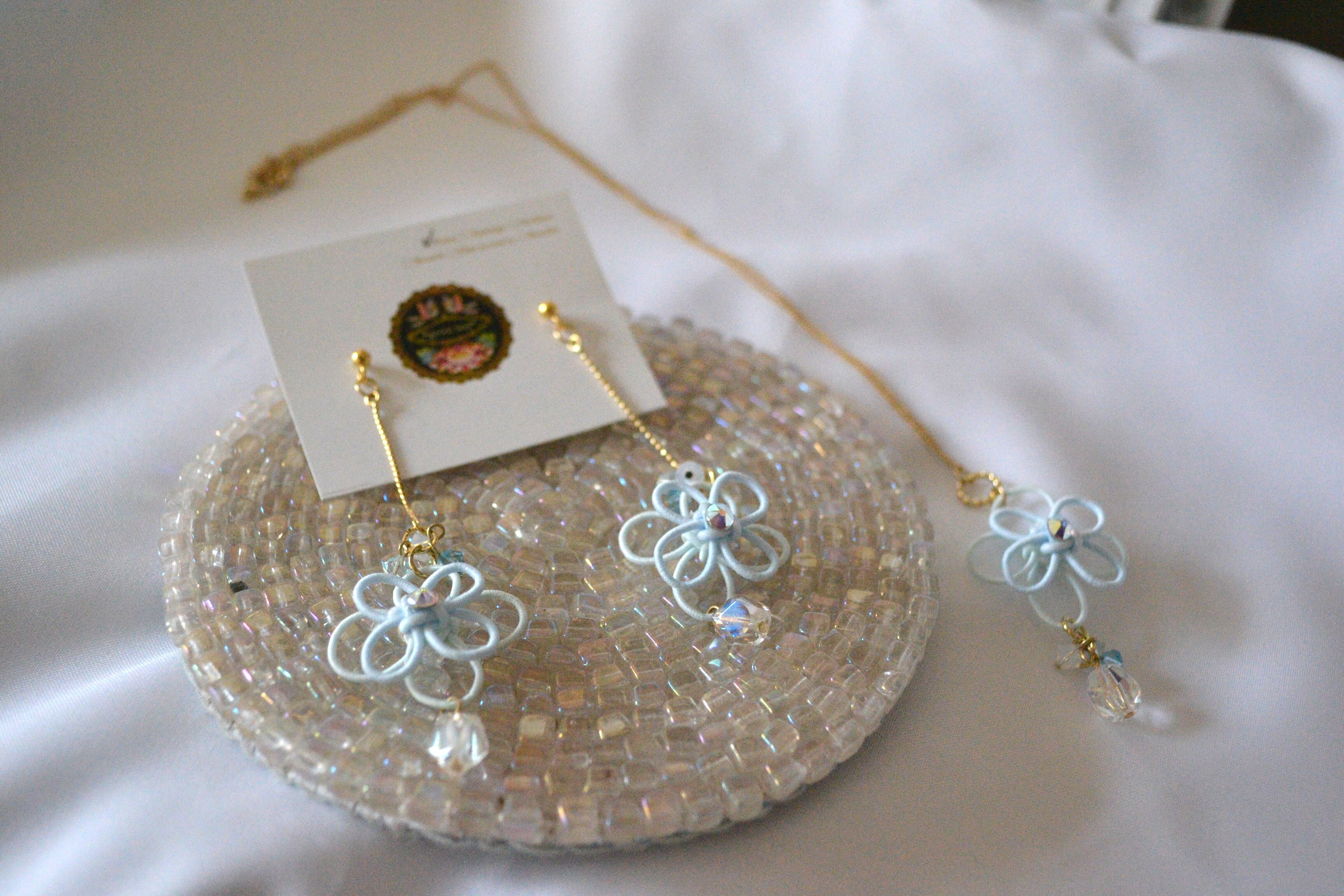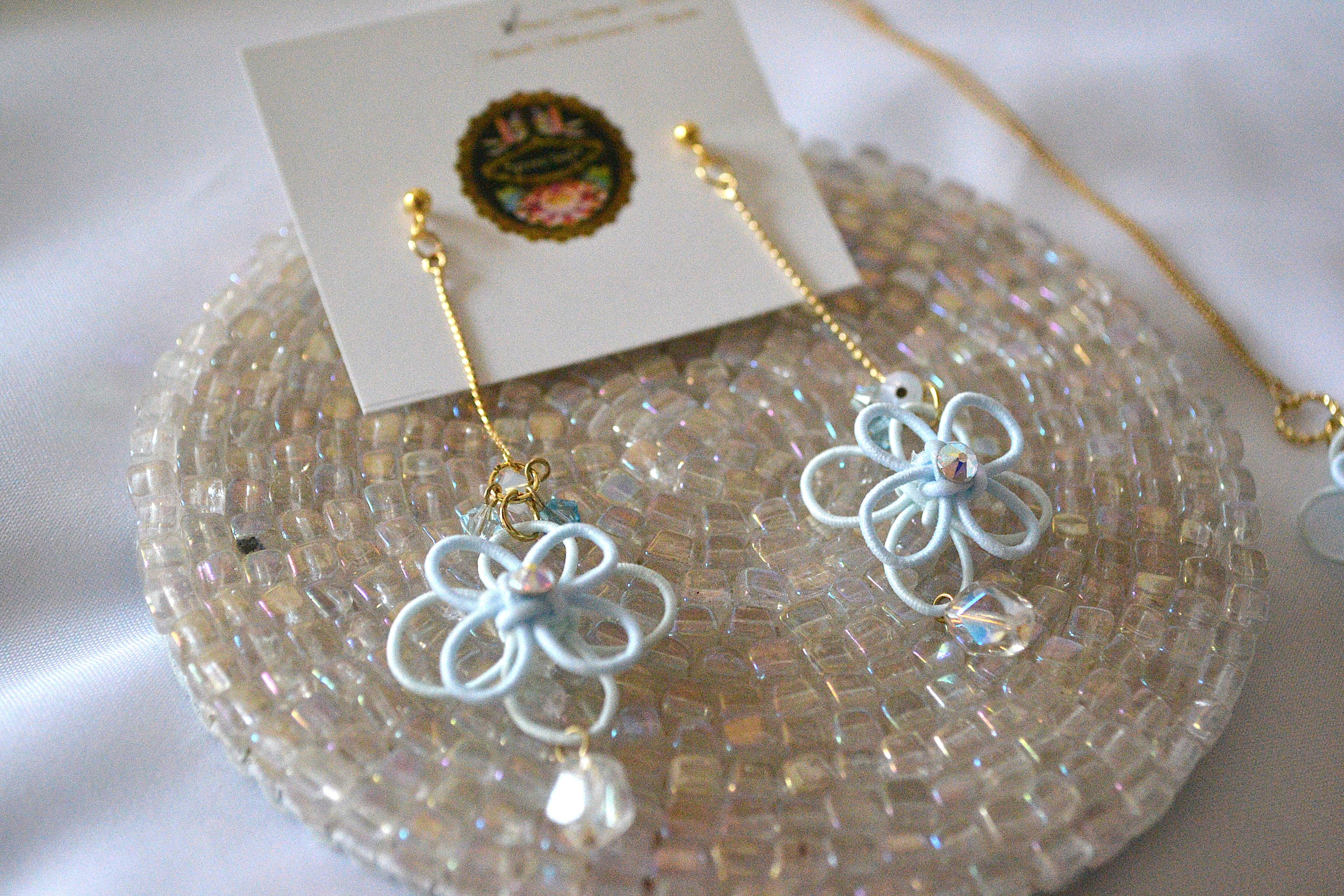 重ね合わせた水引細工で仕上げたお花にチェコビーズやスワロフスキークリスタルを纏わせた透明感と可憐さあふれる耳飾りをお作りいたしました。