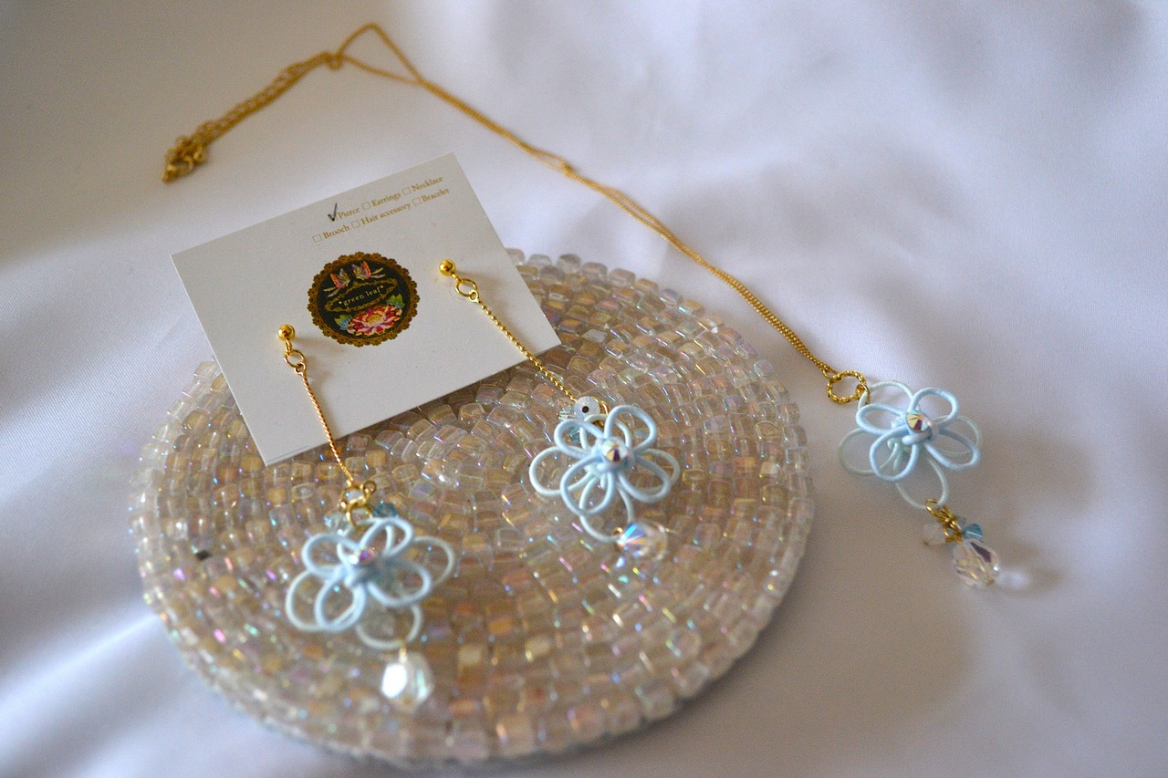 重ね合わせた水引細工で仕上げたお花にチェコビーズやスワロフスキークリスタルを纏わせた透明感と可憐さのアイテムをお作りいたしました。