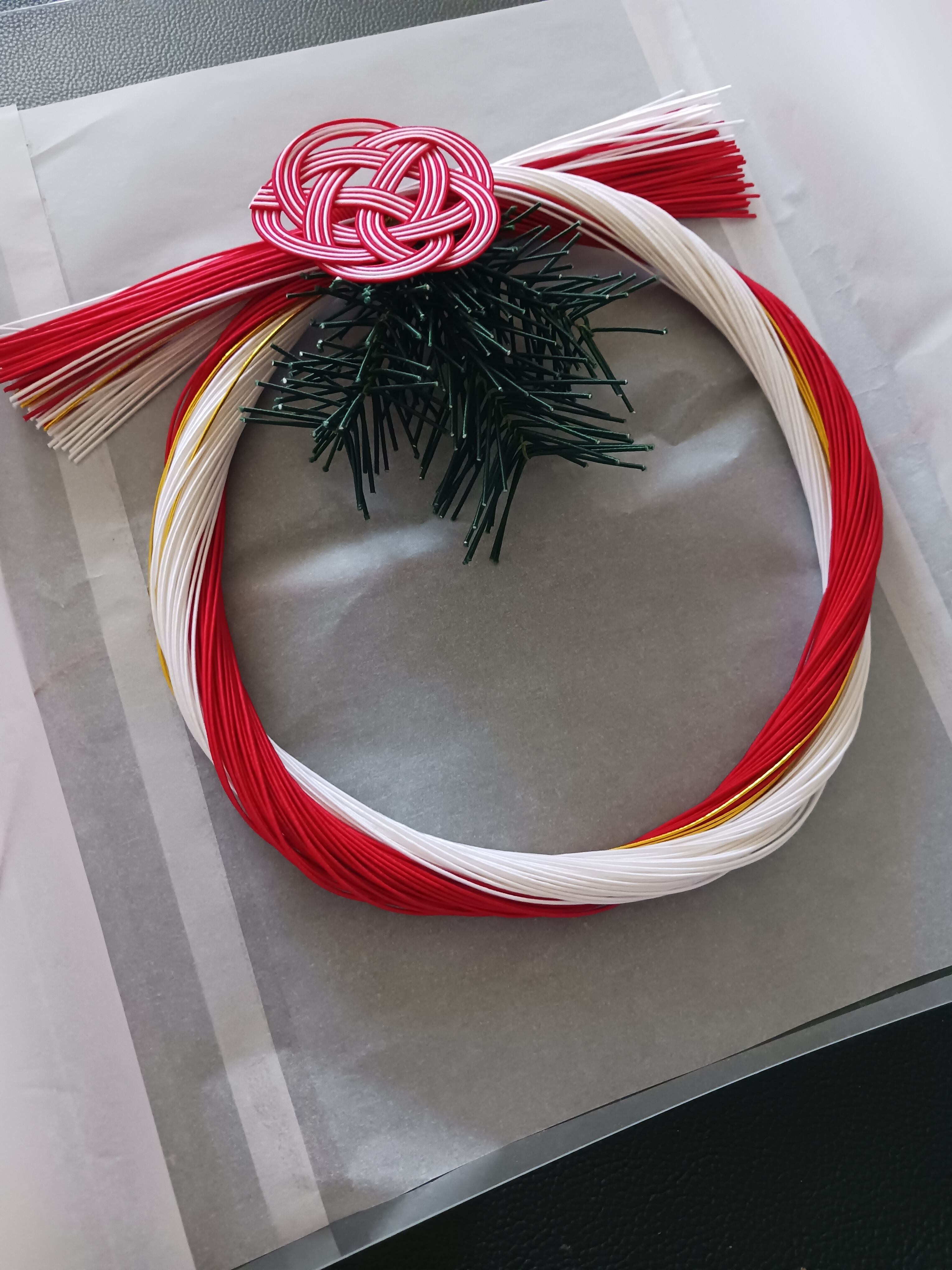 紅白に金を差し色に混ぜたしめ縄に梅と松の葉でシンプルなしめ飾りとなります。