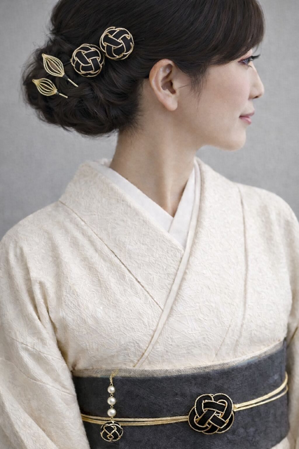 結びの美しさを活かしたモダンで落ち着いたデザインは訪問着・色無地・小紋など幅広い装いに。